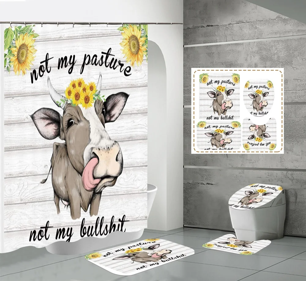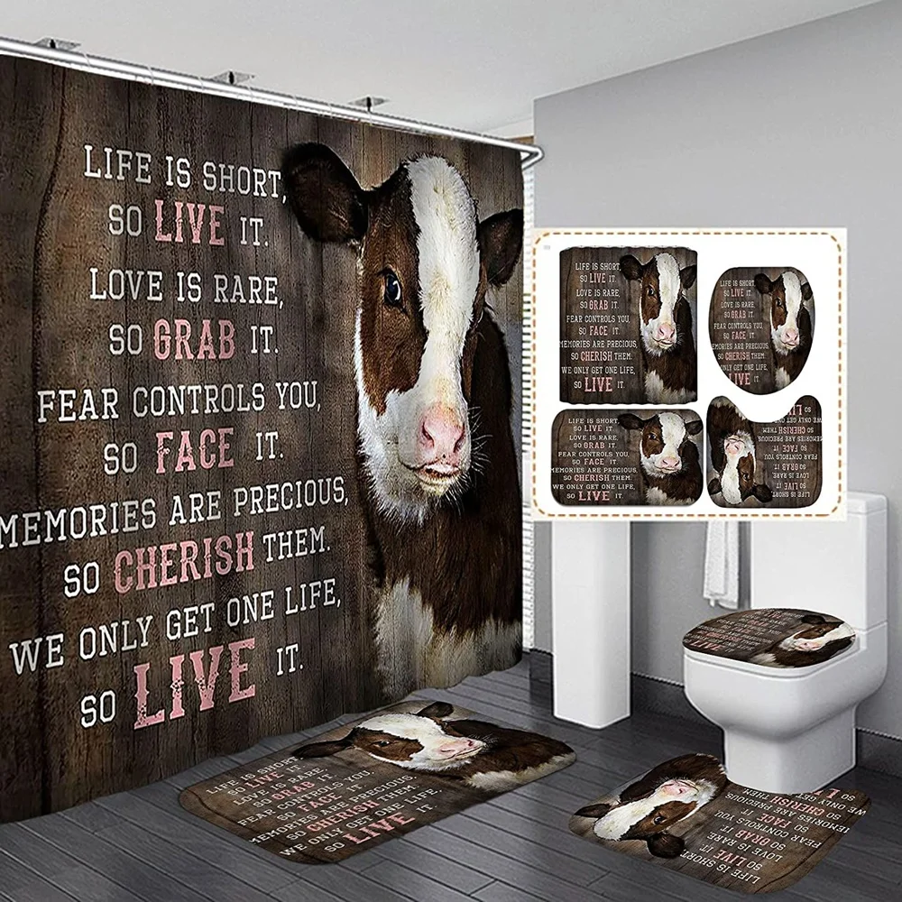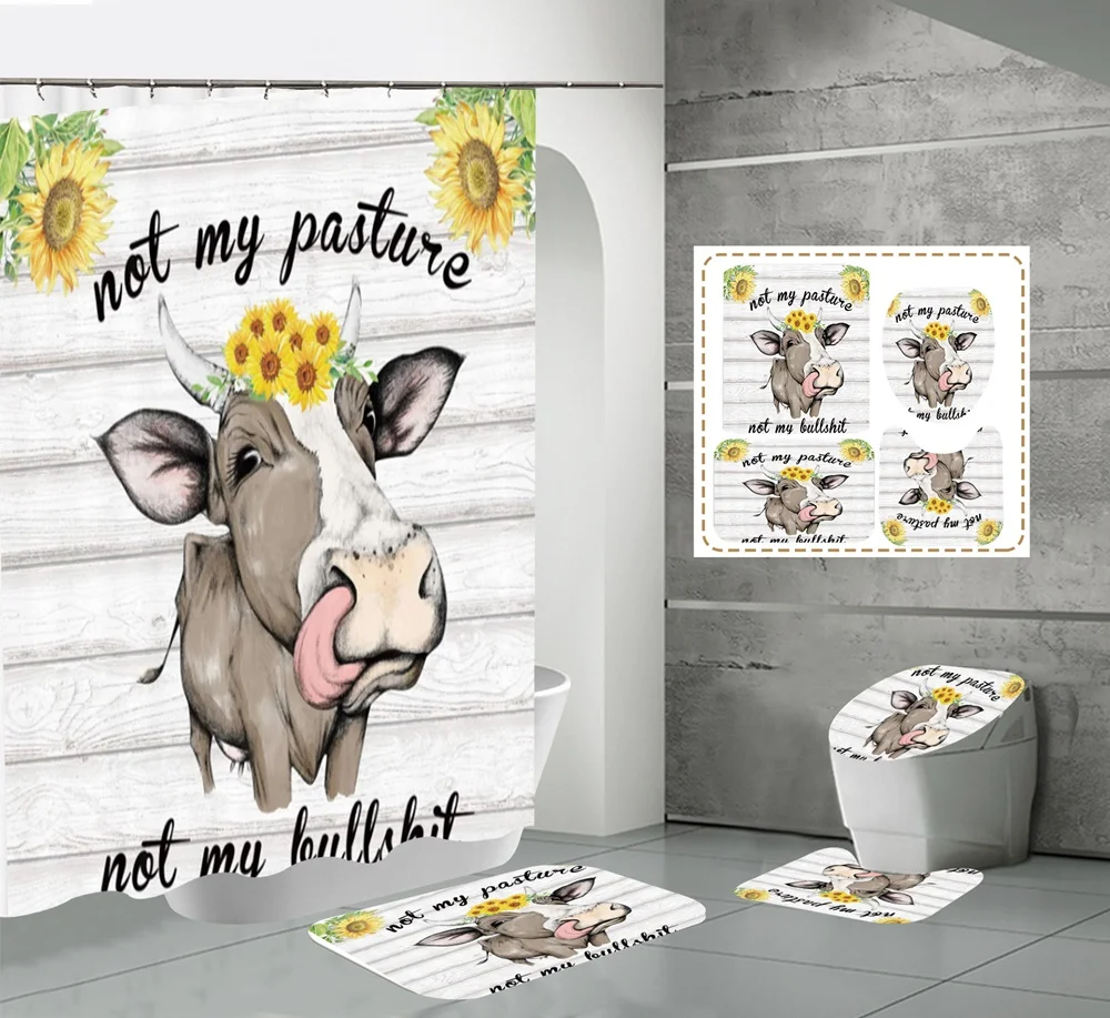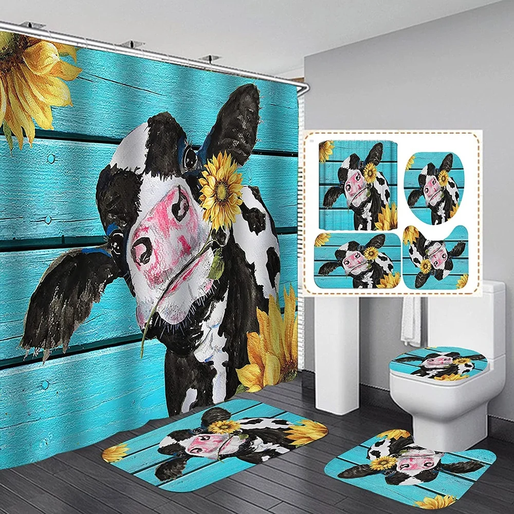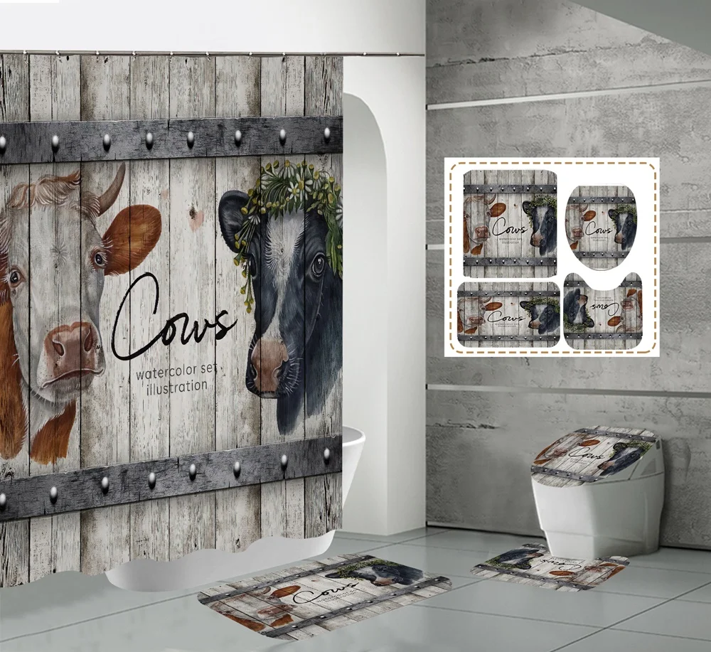 Funny Cow Rustic Wagon Wheel Fabric Shower Curtain Country Flower Wooden Farmhouse Bathroom Decor