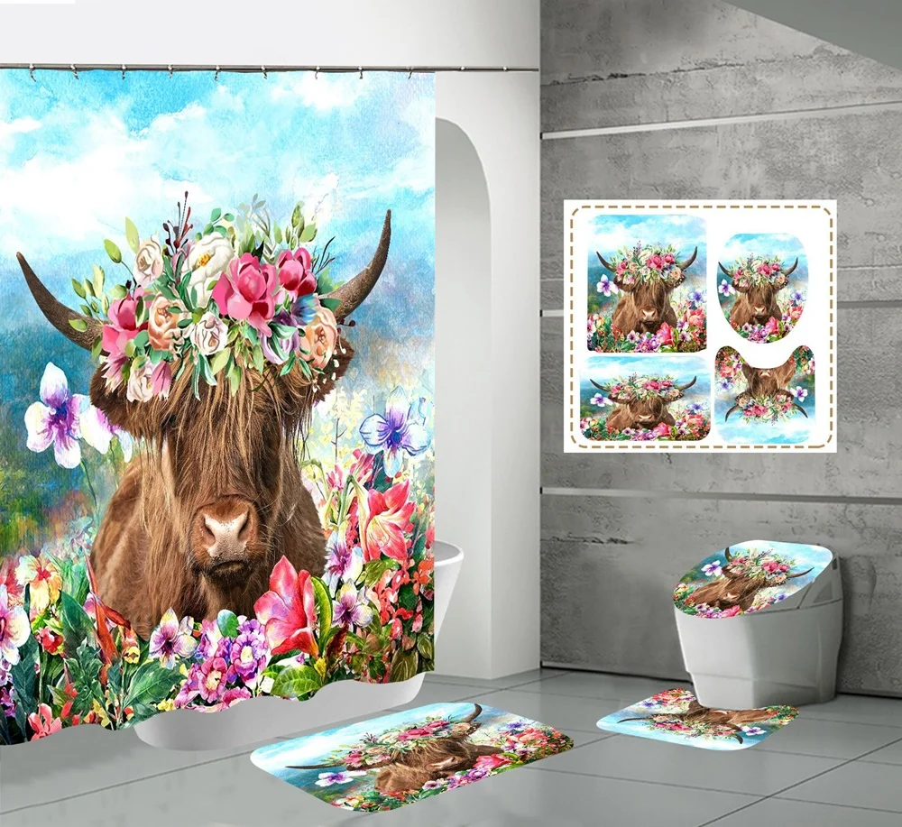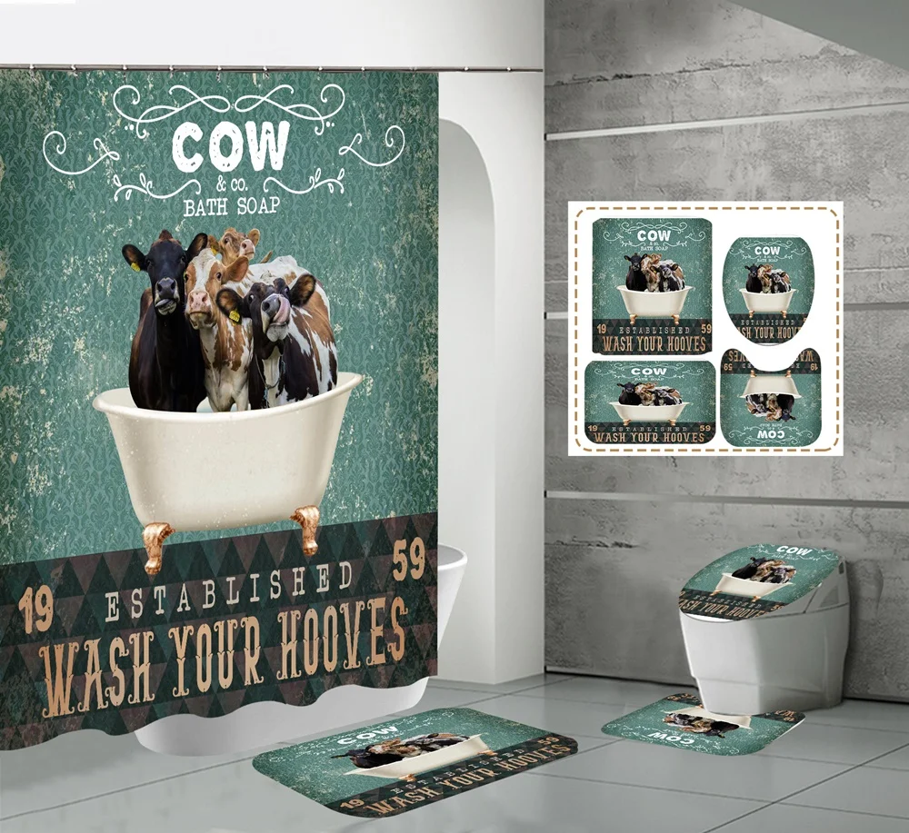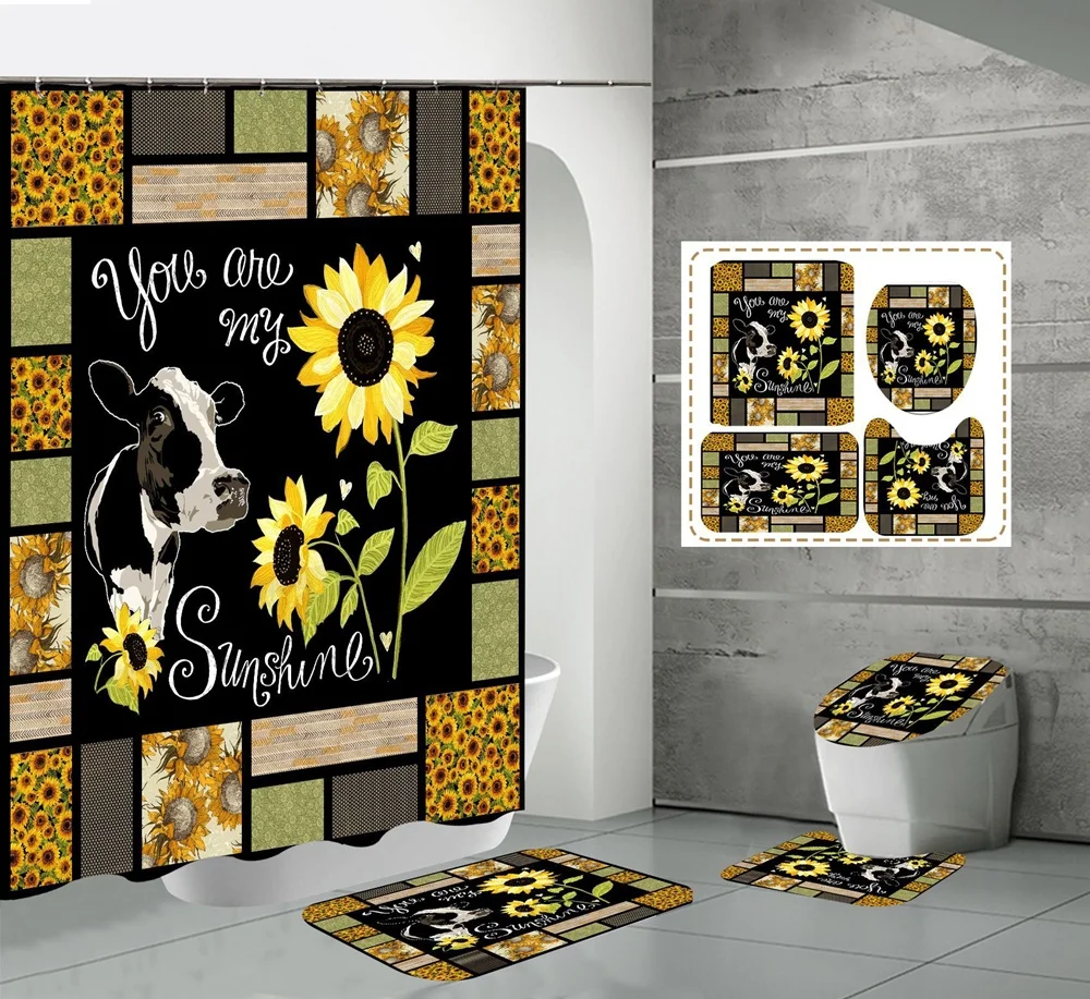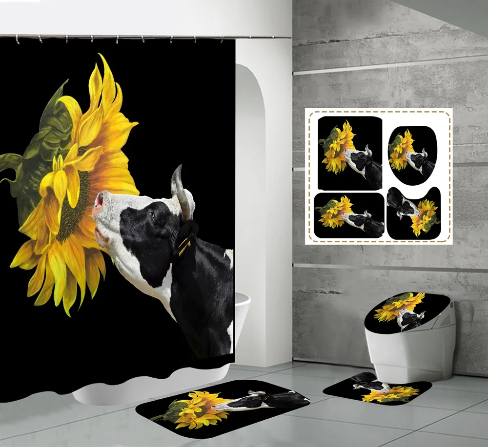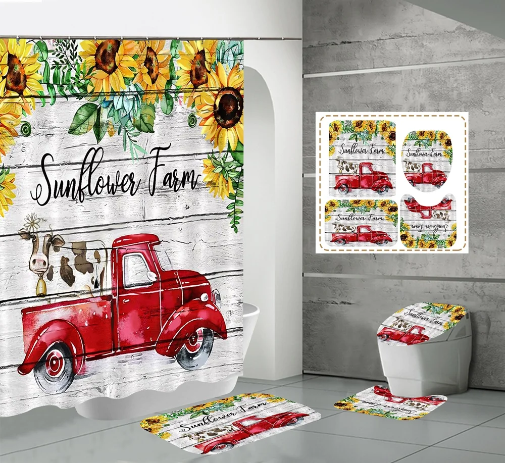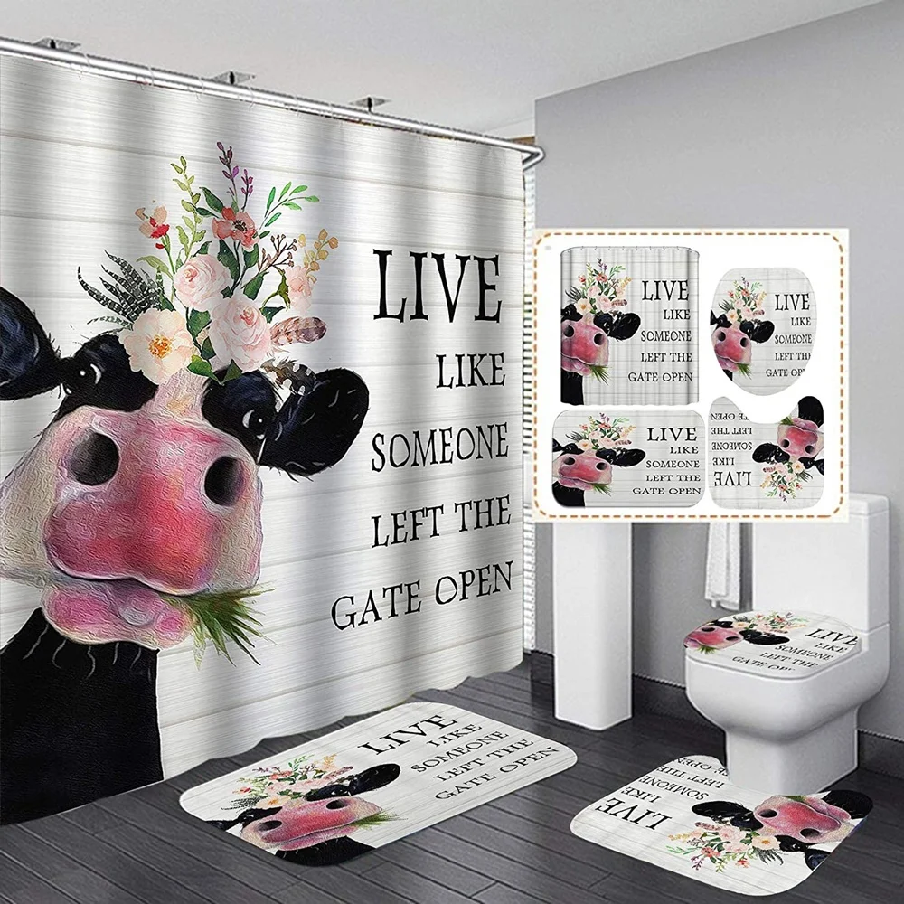 Funny Cow Rustic Wagon Wheel Fabric Shower Curtain Country Flower Wooden Farmhouse Bathroom Decor